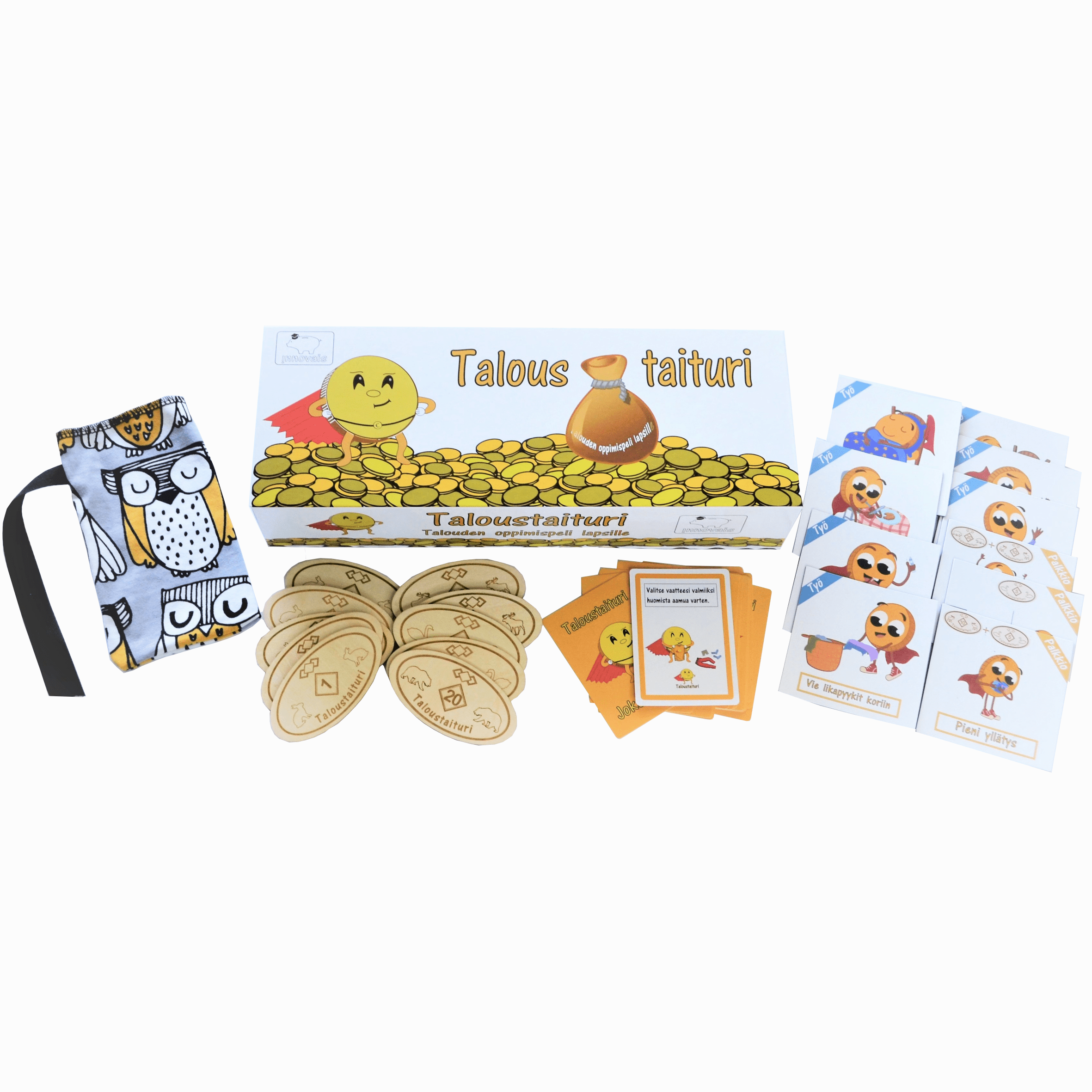 Taloustaituri-aloituspakkauksesta löydät kaiken tarvittavan arjen muuttamiseksi jännittäväksi oppimiskokemukseksi. Taloustaiturin avulla lapselle hahmottuvat talouden perustaidot, kuten ansaitseminen, säästäminen, asioiden arvottaminen sekä vastuullinen kuluttaminen.
