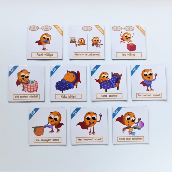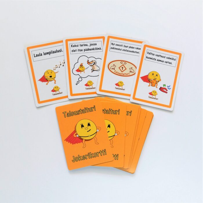 • 20 yllättävää jokerikorttia, jotka tuovat jokaiseen arkipäivään lapsen mielikuvitusta ruokkivia yllätystehtäviä. Näiden suorittaminen johtaa tietenkin Taitorahan ansaitsemiseen.